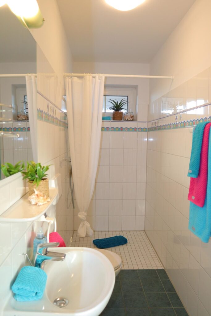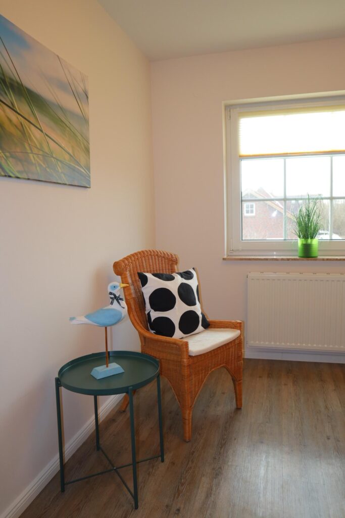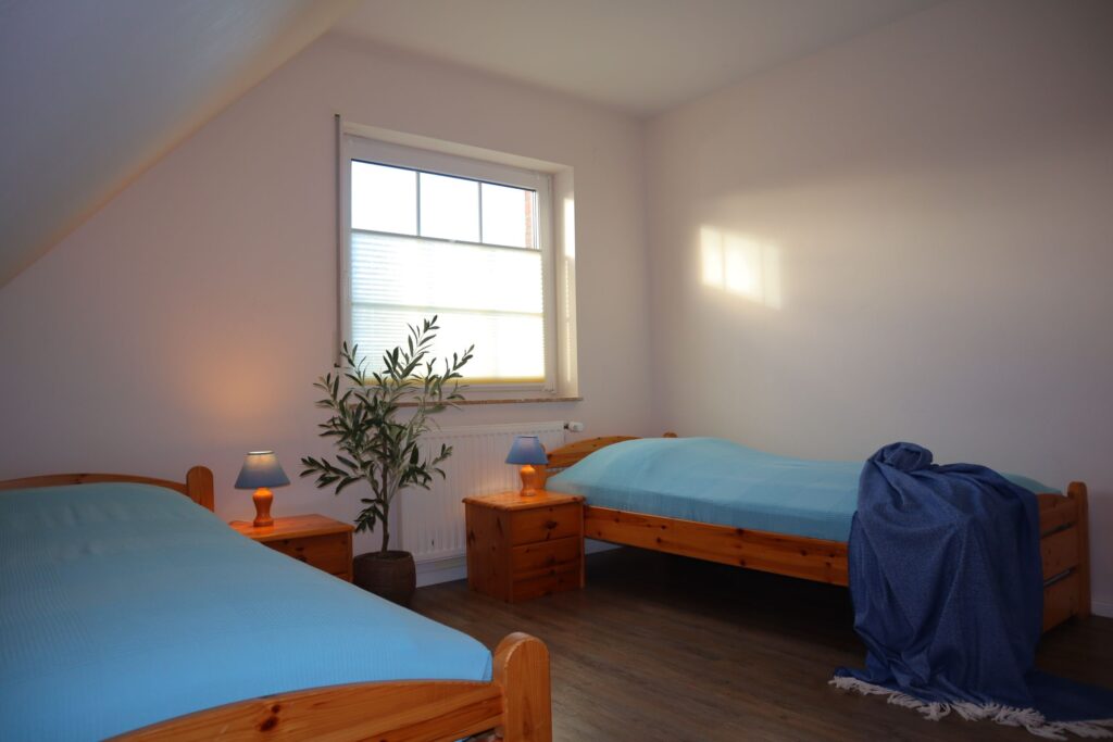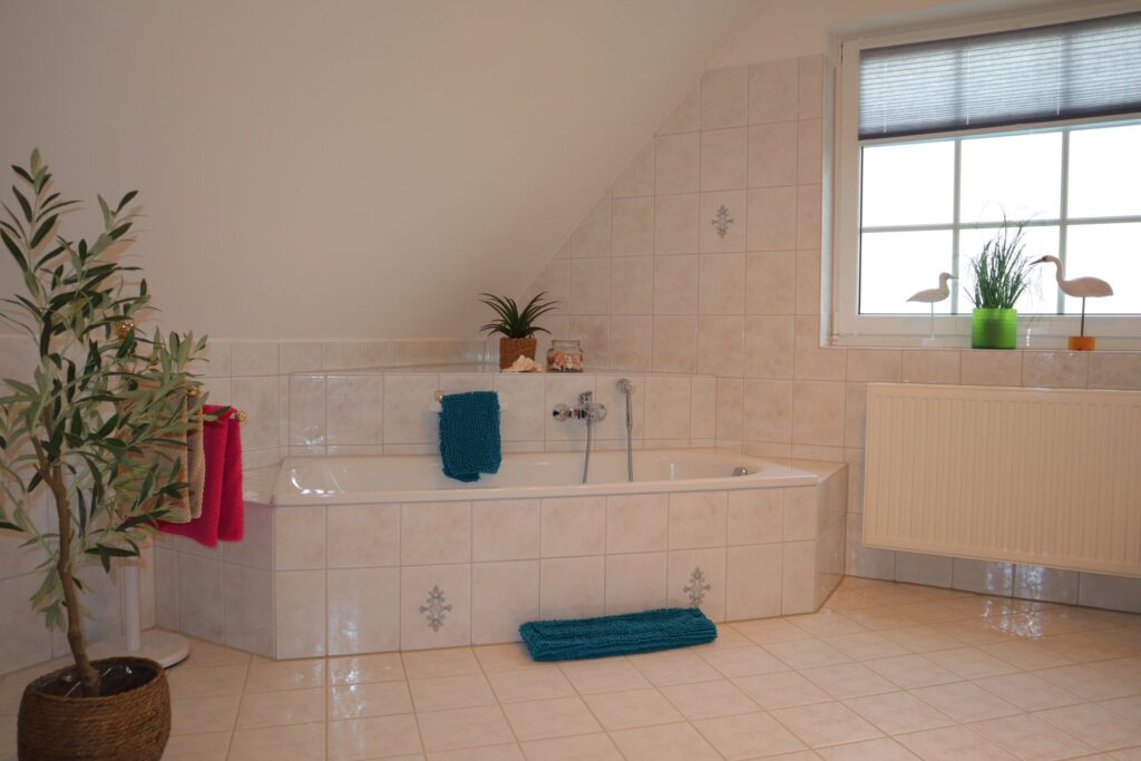 Im Obergeschoss befinden sich drei gemütliche Schlafzimmer, die als ruhige Rückzugsorte nach aktiven Tagen an der frischen Nordseeluft dienen. Ergänzt wird diese Etage durch ein großzügiges Badezimmer mit Badewanne, perfekt für entspannte Wohlfühlmomente, ein warmes Bad am Abend oder entspannte Familienroutinen.