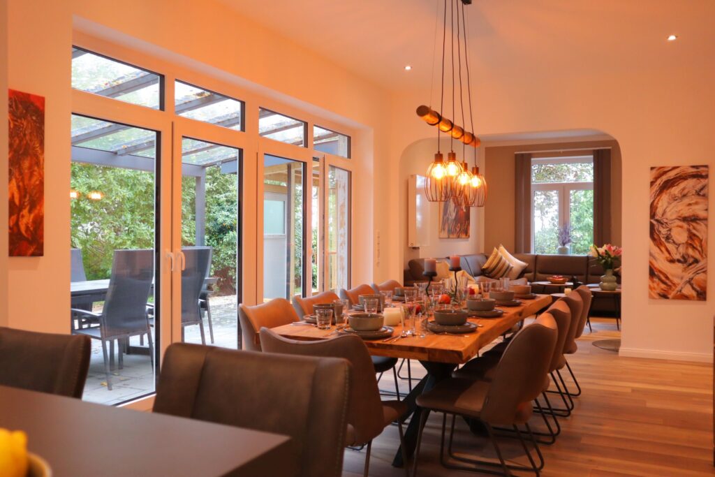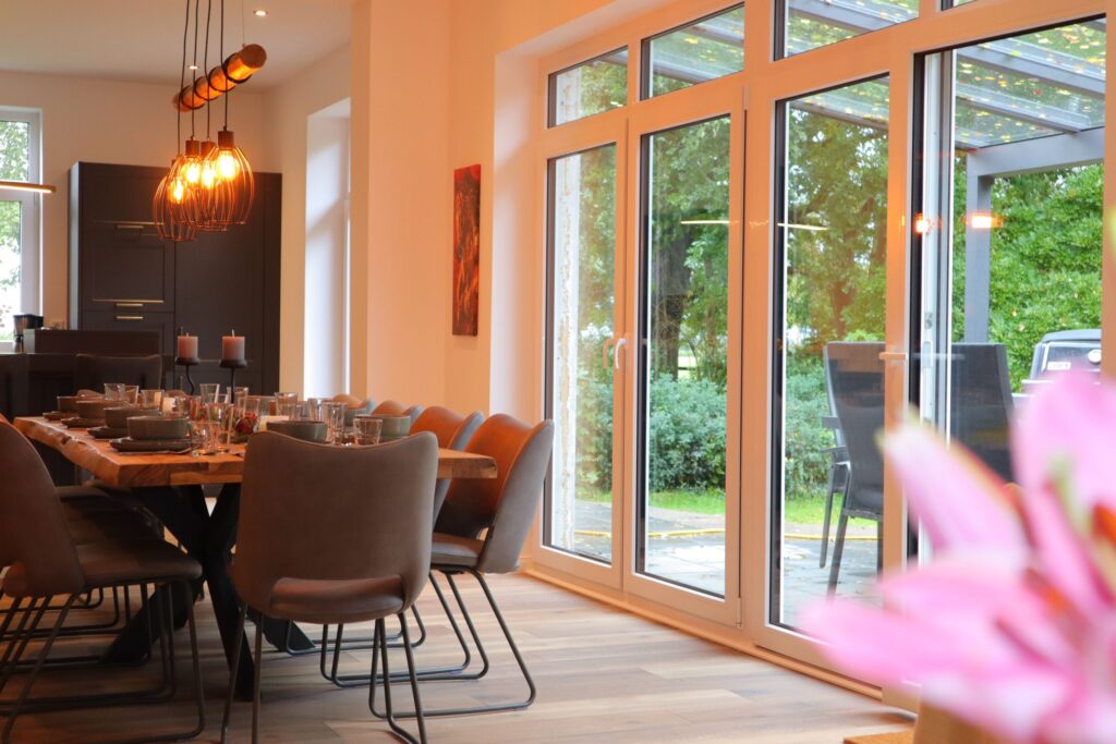 Im offenen Wohn- und Essbereich treffen hochwertige Materialien auf zeitlose Eleganz und natürliche Wärme.