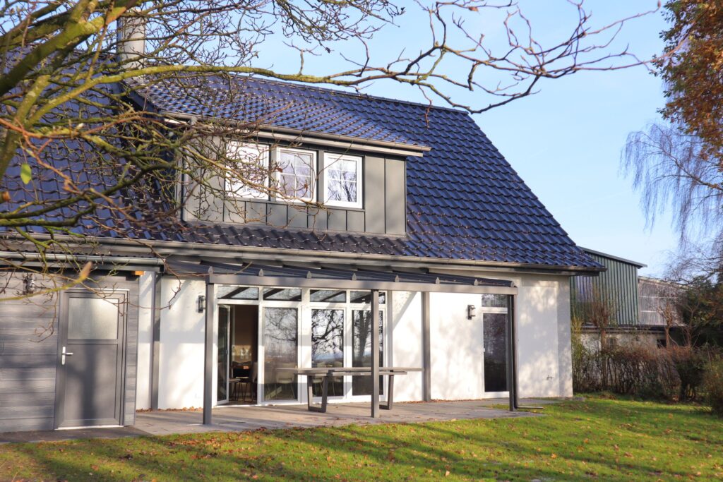 Große Fensterflächen öffnen den Blick in den weitläufigen Garten, der von einer sonnigen Terrasse und einem geschmackvoll eingezäunten Außenbereich umgeben ist – perfekt zum Entspannen und Durchatmen.